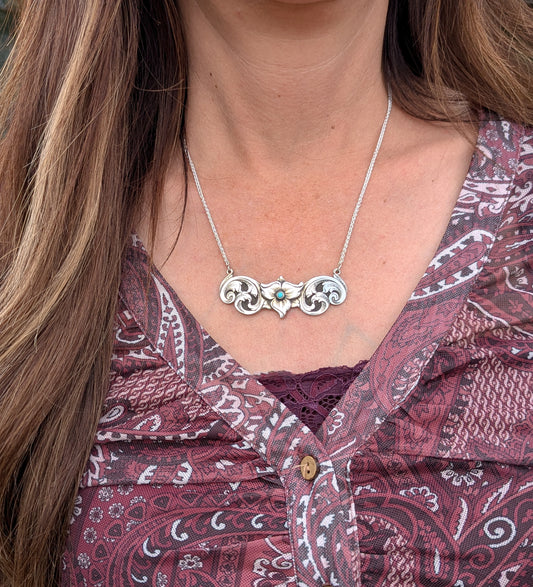 Hand-Engraved Sterling Silver Scrolls with Flower center, Bar style Necklace