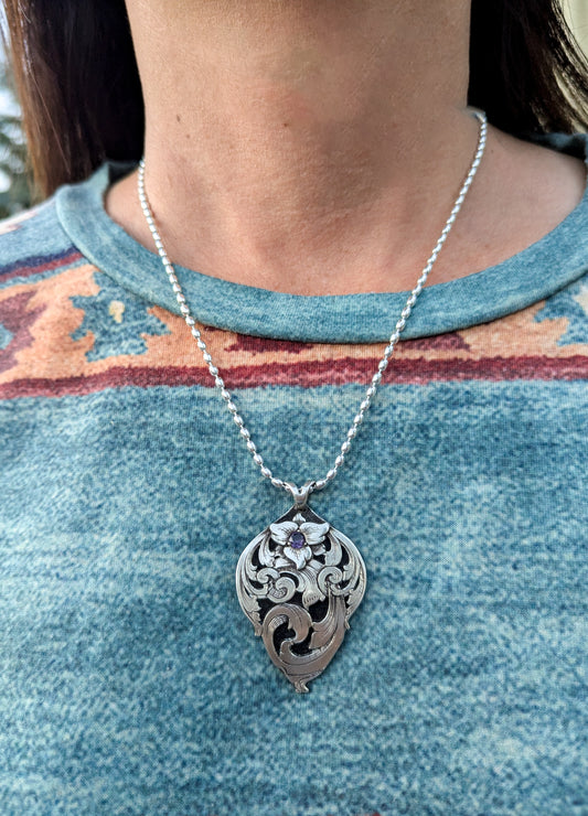Sterling Silver Scroll Pendant with Amethyst Flower