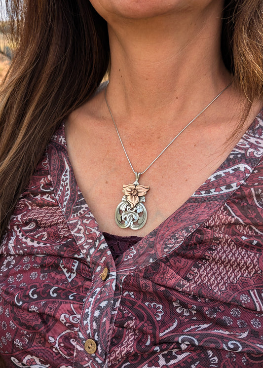 Sterling Silver and Jewelers Bronze Flower Scroll Necklace with simulated emerald center stone