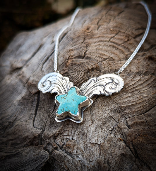 Sterling silver filigree scroll bar style necklace with natural turquoise.