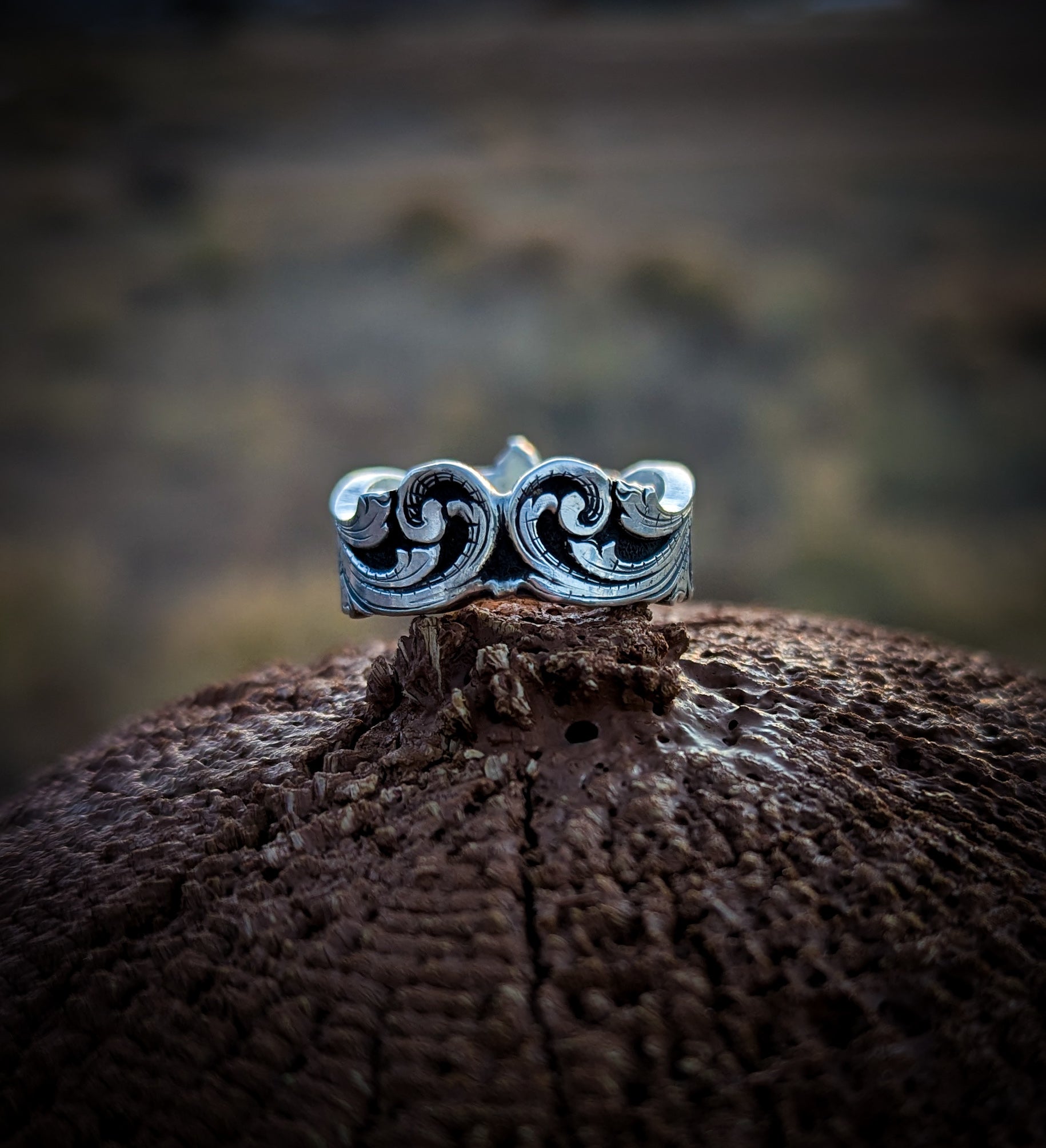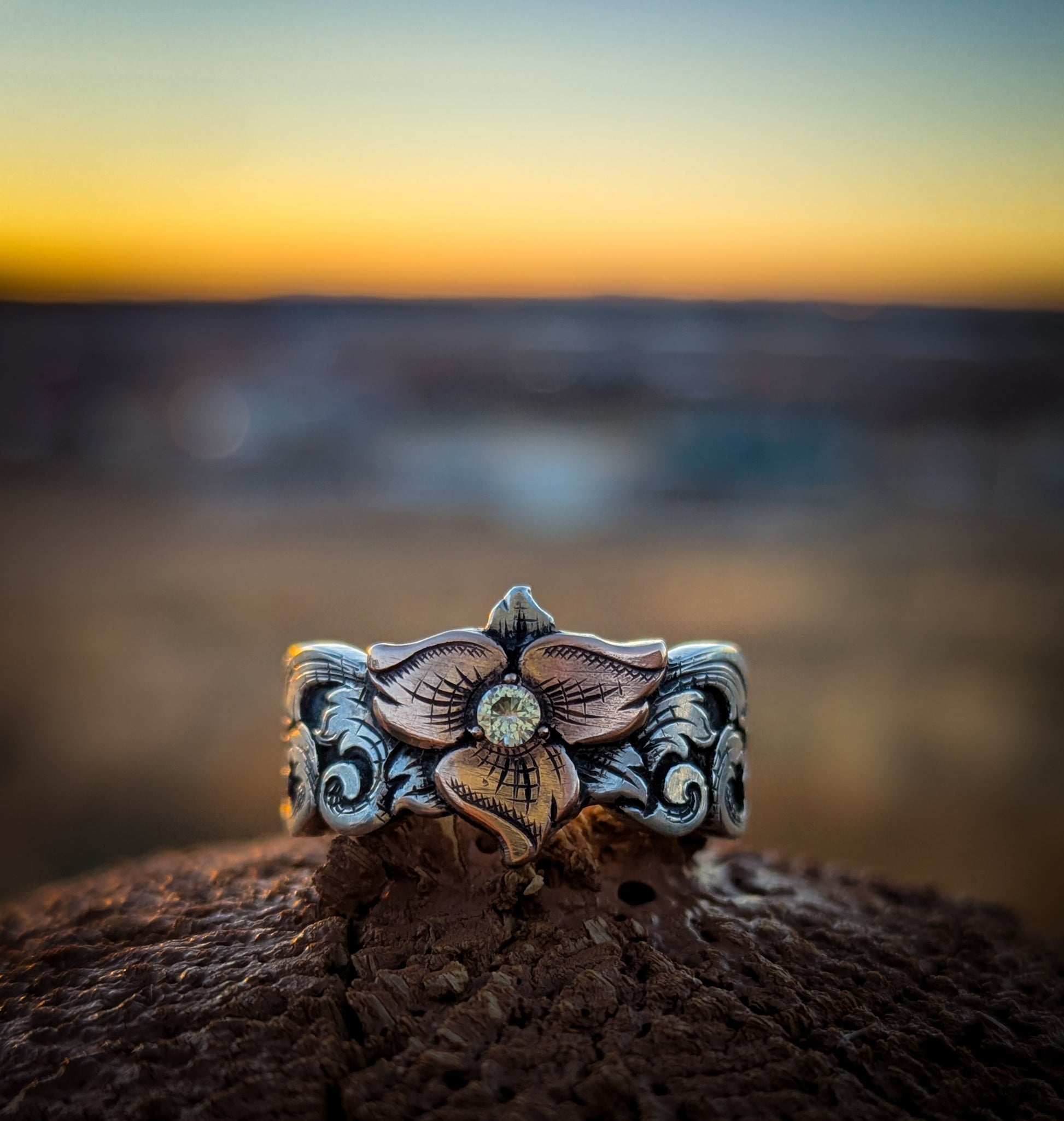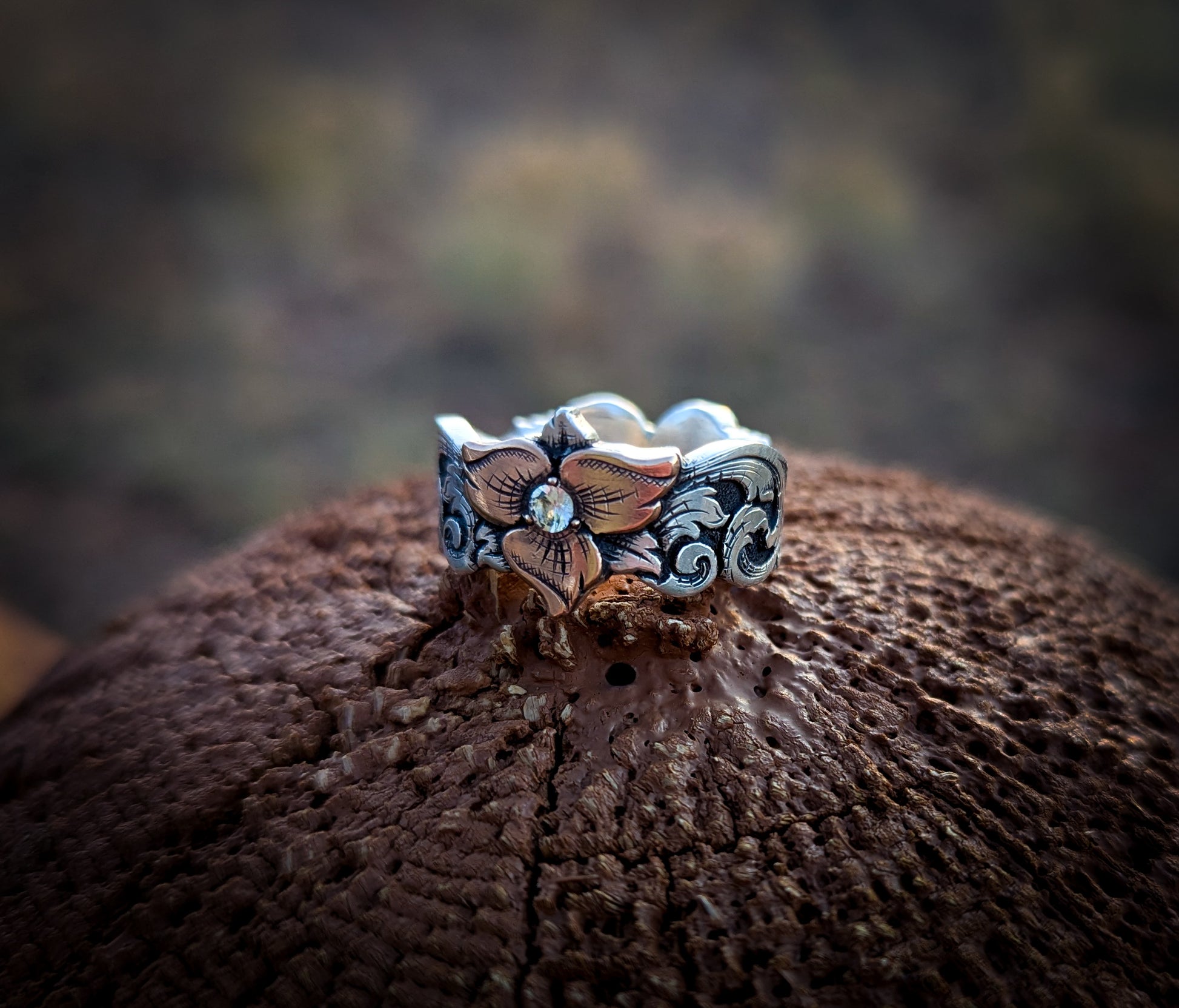 Handmade from heavy 14-gauge solid sterling silver, this close-backed ring features hand-engraved relief scrollwork for bold depth and contrast. The center showcases a handcrafted jeweler’s bronze flower, set with a 3mm clear CZ for clean, eye-catching brilliance. Crafted entirely by hand, this ring combines strength, artistry, and timeless western style.