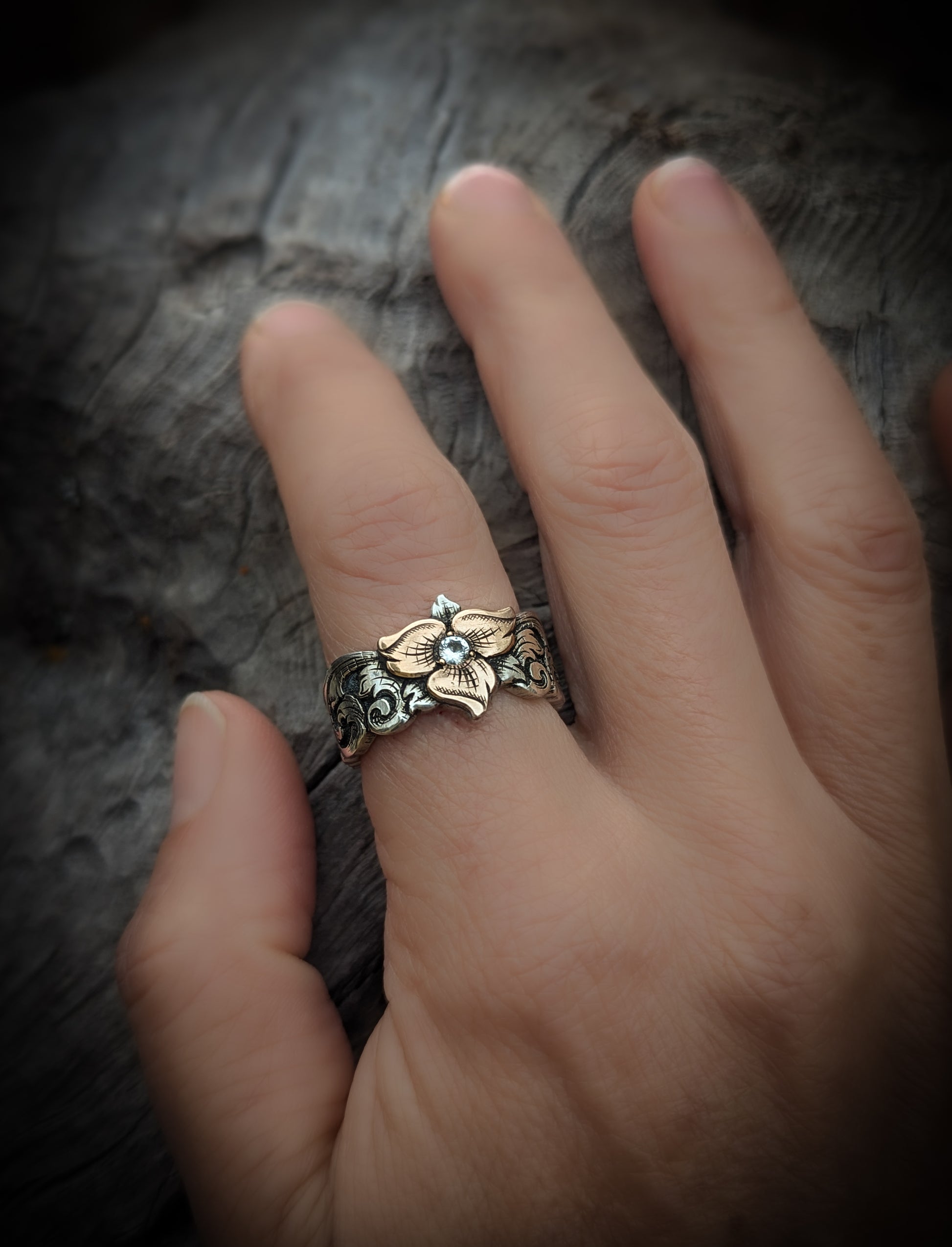 Hand-Engraved Sterling & Bronze Flower Ring — Size 8.5